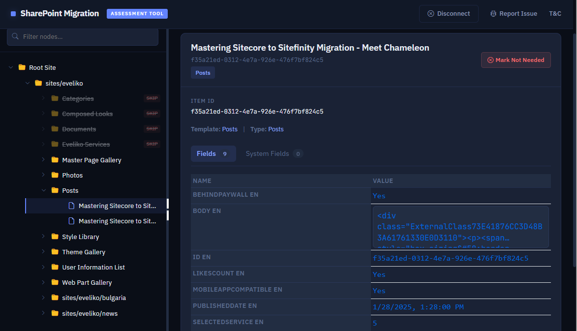 Chameleon resolves field names and values from SharePoint lists and libraries. You can see content types, page layouts, and how data is structured across your sites. This is the foundation for a meaningful migration scope conversation - knowing not just how many items exist, but what they are.